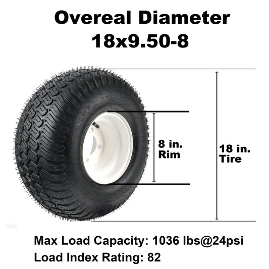 18x9.50-8 Tire and Wheel, 4 Lug 8”x 7”Wheel, 2.83" Central Hole, 4PR, Set of TWO 1000 lbs Capacity for Riding Mower