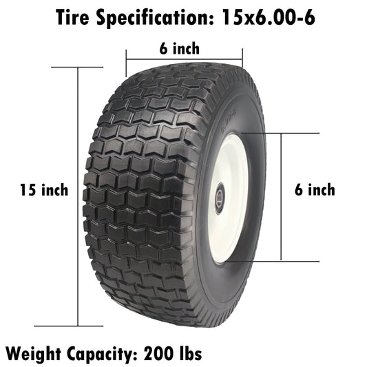 15x6.00-6 Tire, 3/4 & 5/8 Bearing, 3” Hub Flat Free Lawn Mower Tire with Rim