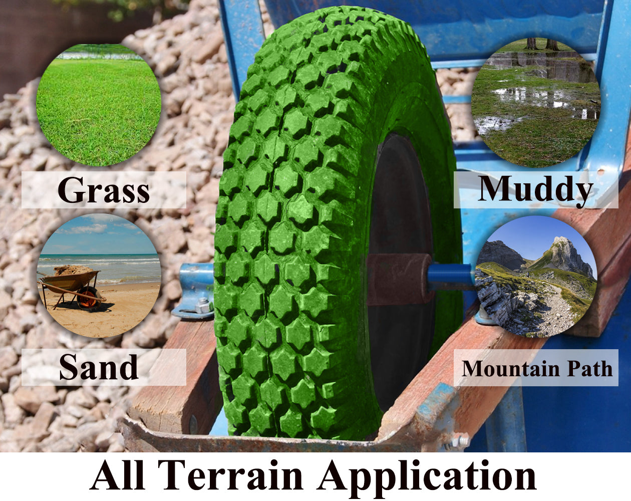 【Dual Bearings (3/4" & 5/8") for Smooth Maneuverability】Equipped with precision 3/4" and 5/8" bearings, this wheelbarrow tire 4.80/4.00-8 reduces friction and ensures effortless rolling even under heavy loads. Ideal for uneven surfaces, reducing user fatigue during prolonged use.